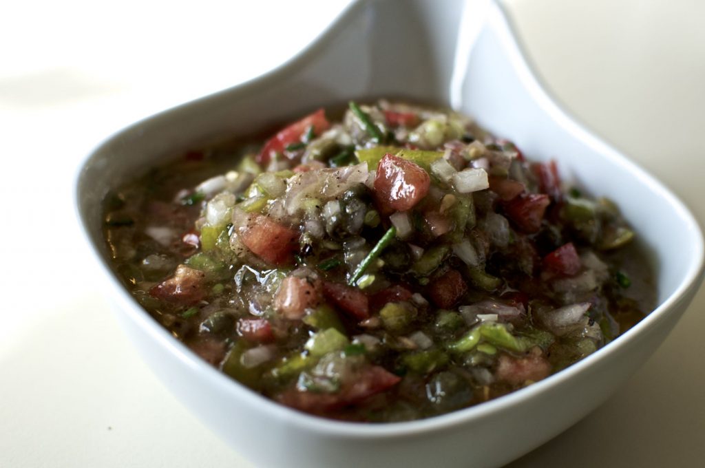 This is a lovely, fresh, healthy, sauce that can pump up a wide variety of foods: eggs, beans, fish, and soups.