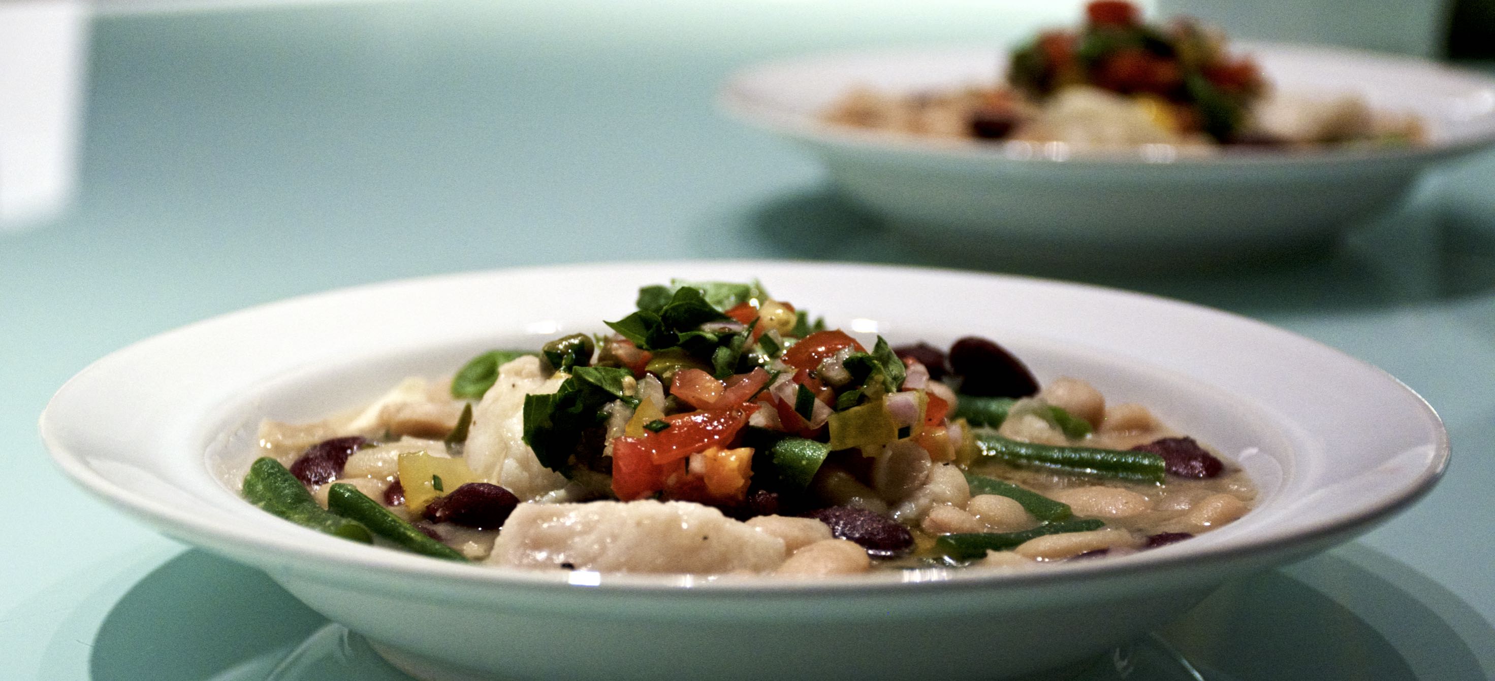 After 5 minutes of simmering toss in the green beans and give a quick stir. Then add the fish. Let cook for 3-5 minutes. Just until the fish is cooked through but not overdone. Taste and adjust seasoning (add more salt or pepper if necessary). Serve in bowls and enjoy.